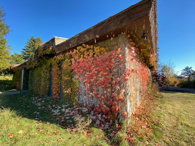 秋になり山々の紅葉に感動する季節、御代田町のとある建物に絡むツタの自然色・カタチ、建物とその背景に見惚れてしまったワンショット。何気ない場所でも目にうつる自然の様子に感性をたくさん養いたいです。